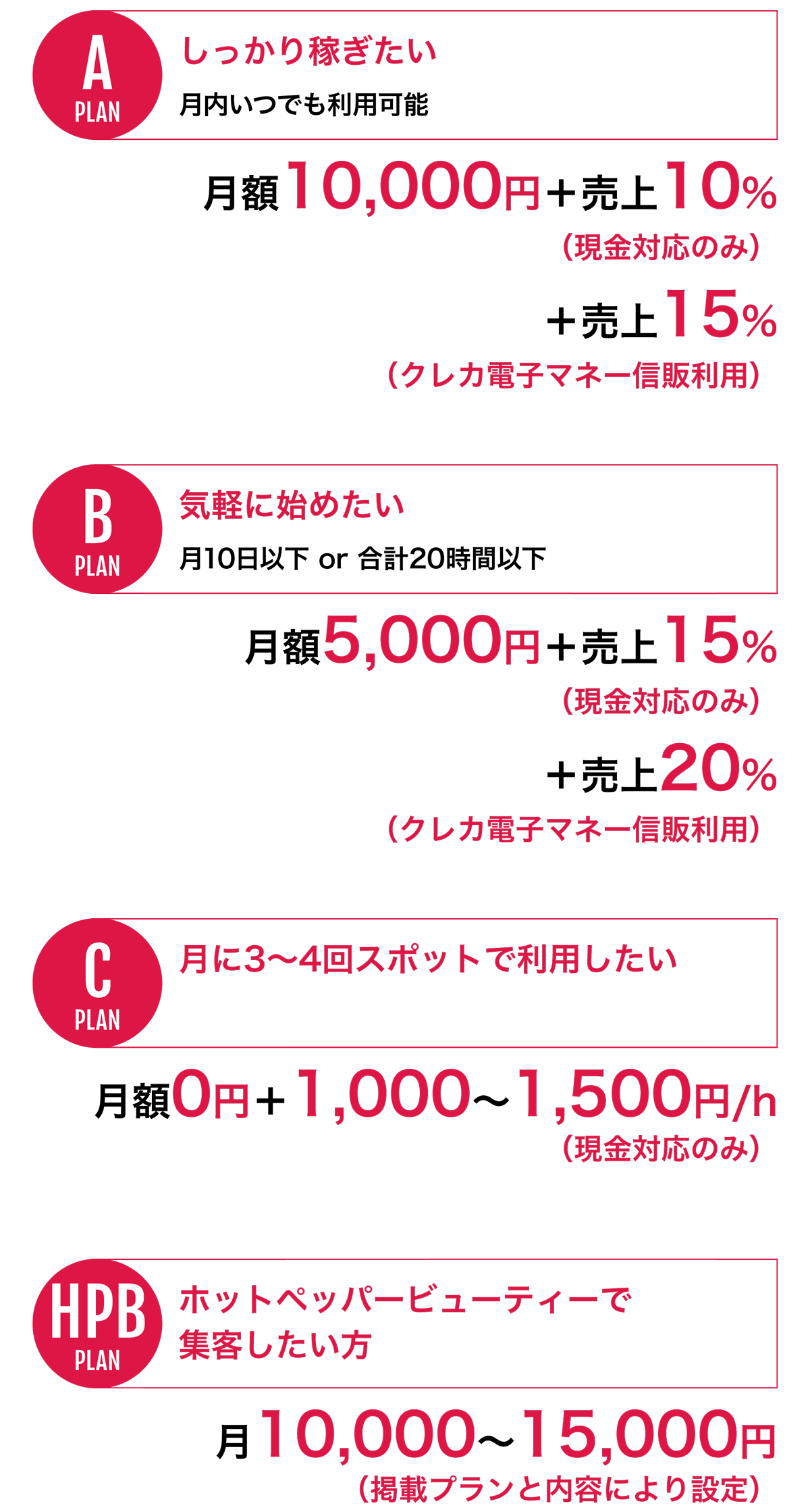 シェアサロン事業 Share Salon Business 美容に特化したスペースレンタルサービス 設備・環境をシェアするだけではなく 既成概念に囚われない新たな働き方を 美容施術者に提供致します。 独立、フリーランスを目指す方をサポートします。 地域に愛される美容スポットを一緒に創りましょう! 現在出店中サービス スペース利用を検討中の方へ ご利用料金 しっかり稼ぎたい月内いつでも利用可能 気軽に始めたい月10日以下 or 合計20時間以下 月に3~4回スポットで利用したい ホットペッパービューティーで集客したい方